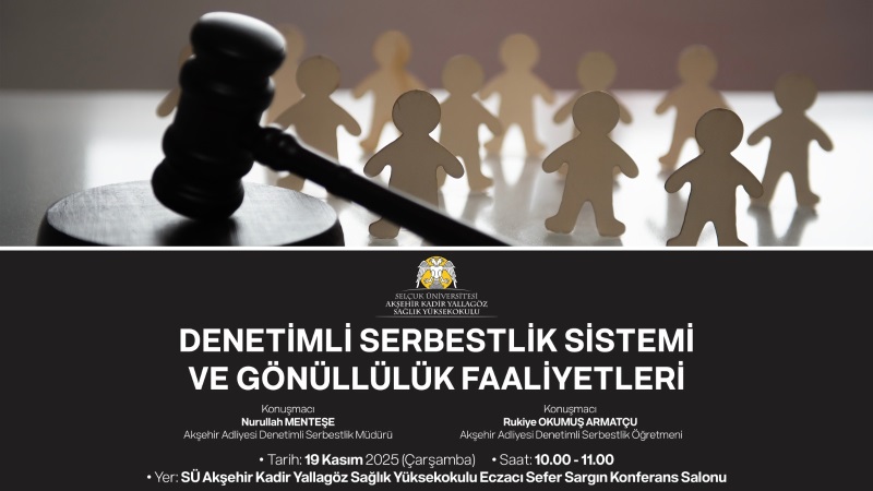 19/11/2025 tarihinde Akşehir Kadir Yallagöz Sağlık Yüksekokulu konferans salonunda Denetimli Serbestlik Sistemi ve Gönüllülük faaliyetleri hakkında seminer düzenlenmiştir.Seminere Yüksekokul Hemşirelik Bölüm Başkanı Dr. Öğr. Üyesi Melike Taşdelen BAŞ, Yüksekokul Sekreteri Özden YUVALI ve öğrenciler katılmıştır. Denetimli Serbestlik Müdürü Nurullah MENTEŞE tarafından Denetimli Serbestlik Sistemi ve Gönüllülük Faaliyetleri hakkında bilgi verilmiş, Öğretmen Rukiye OKUMUŞ ARMUTÇU tarafından da yükümlülerin eğitim ve iyileştirme faaliyetleri hakkında katılımcılara sunum yapılarak denetimli serbestlik sistemi üzerine farkındalık oluşturulmuştur.